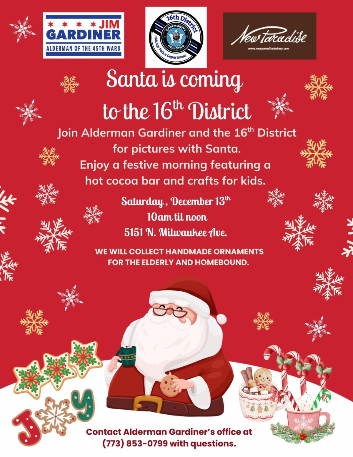 Santa is visiting the 16th District on Saturday December 13 for pictures and hot cocoa and crafts!!