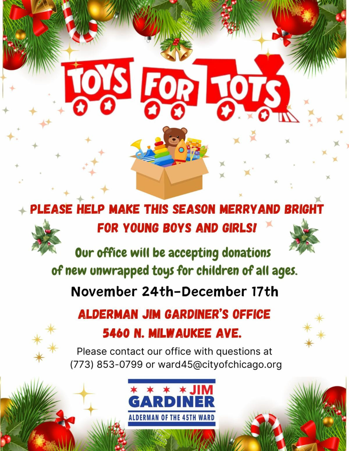 The Alderman is also collecting unwrapped toys for less fortunate children of all ages.